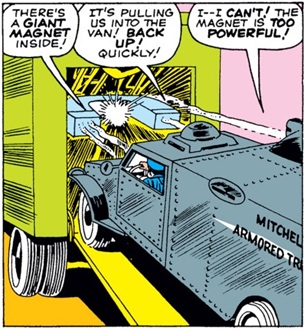 Resembling a common moving van, the Hijacker used it to rob armored trucks. After blocking the road with the van, the Hijacker utilized a powerful magnet (see comments) to pull the armored trucks into his vehicle [...despite their use of brakes, reverse gear, etc.] Once trapped inside the van's cargo box, the drivers and guards were gassed by the Hijacker and rendered unconscious; the dazed guards were dragged out and left on the side of the road, with no memory of the crime because of the amnesia-inducing effects of the gas. --Tales to Astonish I#40/1 |