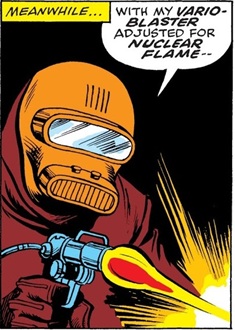 A multi-function handgun used by the Hijacker (see comments), it was connected by a cable to his utility belt. It could be adjusted to fire a nuclear flame heat ray, or an ionic force blast. The Hijacker first used the nuclear flame to melt through the security vault at Stark West, which gave him access to the valuable prototype technology stored within. When he was confronted by the Thing and Black Goliath, the Hijacker used the vario-blaster to activate some of the vault's prototype weaponry against the heroes. He next fired a heat blast at the vault's ceiling, creating a downpour of molten steel to distract the Thing. After the heroes incapacitated the Hijacker's battle tank, the Thing tore off the villain's utility belt, along with the vario-blaster, before the Hijacker had a chance to use it. --Marvel Two-in-One I#24 |