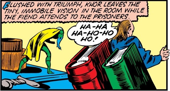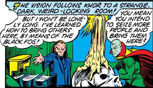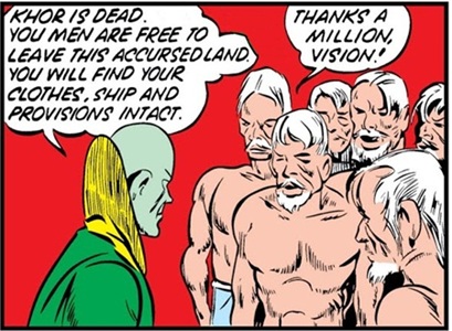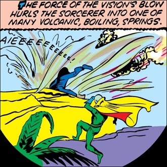 Meanwhile, Khor was whipping his slaves, in an effort to force them to work harder; but he was soon taken by surprise by the Vision, who gave him a severe beating. A final punch from the Vision sent Khor flying into one of the many volcanic boiling springs of the land.