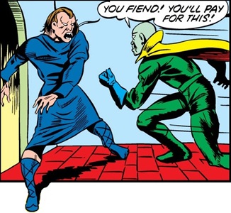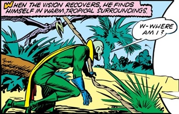 (Marvel Mystery Comics I#22/6) - The extradimensional Vision appeared in the frigid continent of Antarctica to investigate the ship's disappearance, for he sensed evil and terror lurking somewhere in the cold land; but upon arriving, the Vision was confronted by Khor. The sorcerer rendered the Vision unconscious with a magical bolt from his hand, then Khor teleported them both back to the jungle.