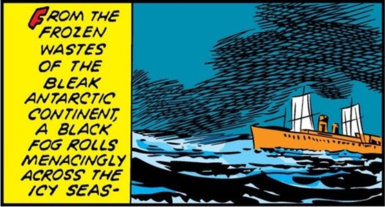 (Marvel Mystery Comics I#22/6 (fb)) - After nearly 700 years in the Antarctic jungle, Khor learned how to teleport others to his hidden land; he planned to avenge his exile by capturing and enslaving enough people for him to rule as king. Using a mystic black fog, he teleported the exploring sea vessel S.S. Olympus to his jungle and put its crew to work as slave-labor (see comments). Although reports of the missing ship made news bulletins, no trace of the vessel was ever found, so the search was abandoned.