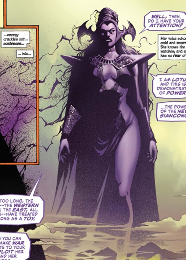 pg. 6 (Lady Lotus, full, with heroic foes in background);