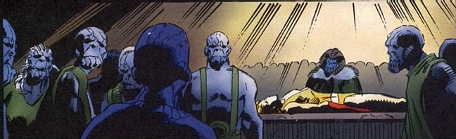 The body is brought before the town council, apparently the local ruling body. They argue about whether he is just a man, a king of old in the flesh, or a god from the stars. They are all humbled by his prescence, and decide they must give him an elaborate funeral, worthy of a high king of old.