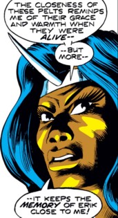 (Jungle Action II#18) - Months after Killmonger's death, she led Mute and her leopards in the slaughter of several Wakandan leopard hunters. When the Black Panther and W'Kabi came to investigate, she directed Mute to capture them as well. She had T'Challa at her mercy, but rather than kill him outright, she tied him to two of her leopards, who drug him across the harsh terrain. T'Challa eventually took advantage of the situation, mounted the leopards and rode them back to her. She stabbed T'Challa in the back as he was struggling with Mute, but W'Kabi shot out her footing and she fell, knocking herself out on a rock.
