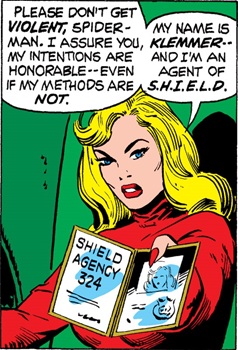 In the snow-covered terrain outside the fortress, Spidey and Frankie came upon a woman skier being menaced by von Shtupf's henchmen, so they saved her, after which she gassed the two. Shortly afterward, the two woke up inside a ski lodge, where the woman revealed herself as Judith Klemmer, Agent 324 of S.H.I.E.L.D. After she told them of von Shtupf's world-conquering scheme, all three headed back to the castle to stop the madman.