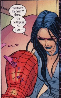 (Amazing Spider-Man II#46, 47) - Shathra attacked Peter Parker, and after a quick fight, from which Peter fled, Shathra went to the press, under a human form, and told them she was Spider-Man's lover. She told them about Spidey's insatiable appetite for sex and kinky habits (of which we cannot know anything about), lied about his honesty, said he used to make fun of the other heroes, and almost revealed his identity before an enraged Spider-Man crashed in the studio and attacked her live on TV. That's what she wanted, an enraged Spider to feed to her children. She reverted to her true form (still on live TV, showing that she was an untrustworthy source), and the fight continued in the streets, with Peter being poisoned by one of her spikes and seeking refuge in a spider exhibit. Shathra was unable to track him among so many spiders, so Peter was safe from her, but dying from the poison.