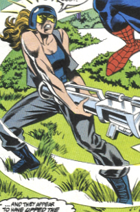 (Web of Spider-Man I#79) - While Peter Parker (the amazing Spider-Man) was taking a carriage ride through central park with his wife they were attacked by the Silver Squad. Peter jumped from the carriage and changed into Spider-Man, and as the Silver Squad threatened Mary Jane Spider-Man came to the rescue and attacked them He fought the Squad who continuously missed with their guns and hit trees, all the while trying to figure out who had sent them. Spider-Man used the Silver Squad's numbers against them, as they accidentally eliminated two of their own members, Purty Larry and Twit, when Spider-Man dodged their blasts, which would in turn hit each other. He then proceeded to destroy Slambeaux by throwing him into Purty Larry's body, which was still discharging electricity. Ripster, however, kept on attacking Spider-Man, who led her away from Central Park to avoid injury to Mary Jane. He proceeded to inadvertently lead Ripster into a crowded area of New York City, and was so busy trying to lead Ripster away from there, that he wasn't able to fight back against her. Eventually, they came face to face atop a tall building, and the two began to fight. Ripster proved to have been much more powerful than any of the other members of the Silver Squad, and as the two fought, neither was able to get any real advantage. Eventually Ripster hurled herself at Spider-Man, and the two were both thrown off the building and plummeted several stories to the concrete floor below. Spider-Man was knocked out cold and Ripster, though badly damaged, carried Spider-Man's unconscious body to the lair of Silvermane.