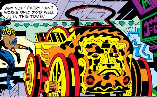 (Black Panther I#3) - The Panther, along with Mr. Little and Princess Zanda, managed to fly through the hidden opening in the mountains that hid the tomb from the world. Pursued by Hatch-22, a being accidentally summoned from the future by the Brass Frog, they made their way through the tomb to find the second Frog, so they could send the future-man back to his own time.