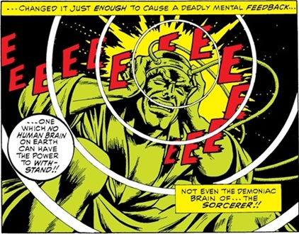 But during the confrontation, a mailman unexpectedly rang the doorbell of the Sorcerer's home--the shrill sound of the bell changed the mystic pitch of the Psycho-Intensifier, and the resulting mental feedback destroyed the Sorcerer's mind. --Marvel Super-Heroes II#14/1 |