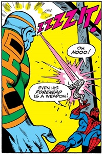 The Sorcerer then used his Psycho-Intensifier to cause Spider-Man (as Peter Parker) to book a flight to New Orleans. Shortly after arriving, Spider-Man was directed to a warehouse, where he was attacked by the Synthetic Man, into which the Sorcerer was projecting his mind (see comments). Spider-Man, still suffering from the headache and some residual weakness, was initially unable to stop the Synthetic Man, who overpowered him.