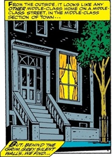 The residence of the Sorcerer (Jonathan East), it appeared to be a typical middle-class brownstone building located somewhere in New York City. But inside, it contained a vast collection of occult objects, along with the Sorcerer's Psycho-Intensifier. From the comfort of his home, the Sorcerer remotely conducted his campaign of psychic attacks against Spider-Man. The front door on the exterior of the building was equipped with a doorbell, and an ordinary mailman unintentionally brought about the defeat of the Sorcerer by simply ringing the doorbell. --Marvel Super-Heroes II#14/1 |