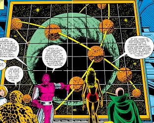 (Marvel Two-in-One I#63 - BTS / Warlock I#14 - BTS / Marvel Team-Up I#55 - BTS) - As Warlock overcame this problem, Sphinxor again manipulated the Soul Gem, making Warlock believe he had grown to the size of a solar system, correctly assuming that Warlock, unable to interact with Counter-Earth, would leave the area...which he did, initially.