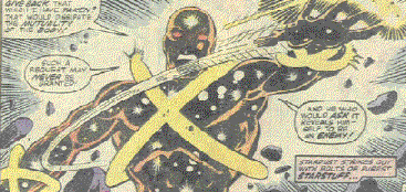 Powers: Stardust possessed a large degree of energy manipulative powers. It was composed of energy and did not have human limitations. It could travel through space unaided. It could drain the life force from other beings to increase its own power. It possessed some degree of superhuman strength, most likely a result of focusing its energies into kinetic energy. It is bound in "starstuff" bonds, which limit its power. Without the bonds, it is significantly more powerful.