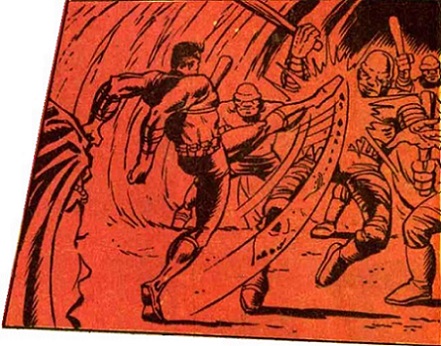 But once Fury arrived and entered the cavern, Supremus trapped him behind steel walls and sent Half-Man to slay him. Fury tried firing his laser pistol at his four-armed adversary, but Supremus had erected an invisible shield in the cell that negated the power of his weapon. Although unarmed and physically outmatched, Fury realized he was the only hope for mankind, so he punched Half-Man and caused the creature to drop its spear; grabbing the weapon and hurling it, Fury impaled Half-Man with the spear, apparently killing the creature. But moments later, Fury was incapacitated by knockout-gas.