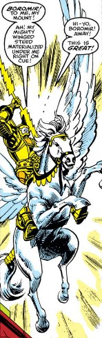 Boromir was Thundersword's winged steed. An artificially-created being, Boromir disappeared when Thundersword first lost his powers, and was recreated when he regained them.
