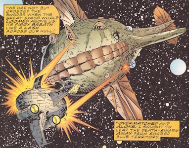 crossed the border into Absolom Sector when it came under attack by a Brood-controlled Acanti space whale.