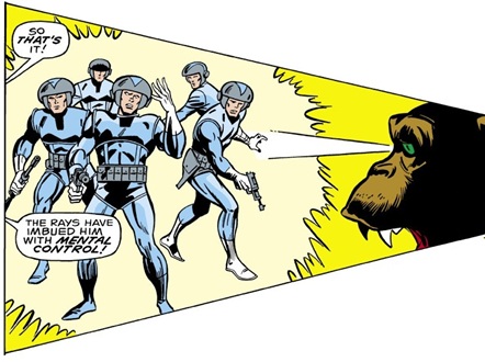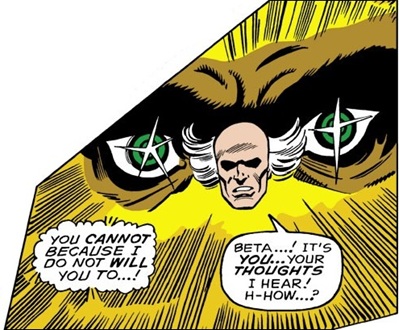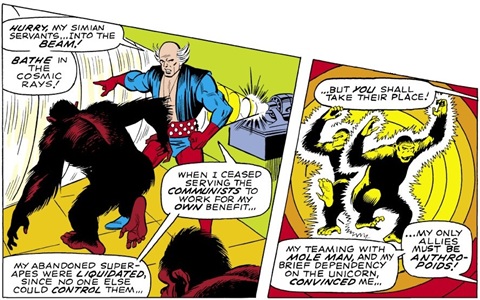 But when the Red Ghost tried to activate his Ultra-Intensifier to empower the simians, Beta mentally stopped him and telepathically informed the Ghost that he rejected his plans to gain power by enslaving the gorillas ("Pursue your insane goals among fellow humans, Red Ghost...you'll find no more allies among the apes!"); then Beta ordered Alpha to destroy the Ghost's machine.