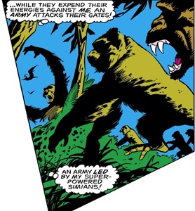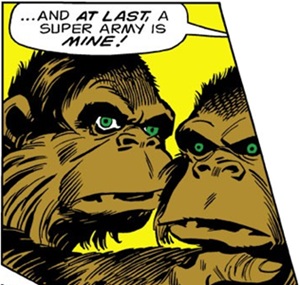 (Iron Man I#16) - The Red Ghost's aircraft landed "deep in the the heart of Africa's gorilla country," where there just happened to be a S.H.I.E.L.D. satellite-tracking station and environment research center--this was where the Ghost intended to obtain the components to build his Ultra-Intensifier. Using his power, the Ghost infiltrated the S.H.I.E.L.D. station and deactivated the surrounding electric fence; Alpha then used his enhanced strength to tear through the steel fence, while Beta used his mental powers to immobilize the base's personnel and gather an army of fellow gorillas.