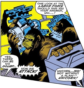 With the S.H.I.E.L.D. base now completely under his control, the Red Ghost had his gorilla army gather the components to build his Ultra-Intensifier; but just as his task was nearly complete, Iron Man and the Unicorn arrived, so he ordered the gorillas to attack them. The ordinary gorillas proved to be no match for the combined might of Iron Man and the Unicorn, and the apes quickly scattered.