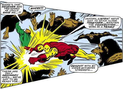 Iron Man I#16, p14, pan3 (Iron Man and Unicorn battle gorilla army)
