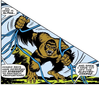 One of the two gorillas used by the Red Ghost, who had honed Alpha's killer instincts and trained him to fight like a veteran warrior. Prior to his mutation, Alpha possessed the ordinary strength of a gorilla; but following his exposure to the radiation of the Cosmic Ray Intensifier, Alpha was granted super-strength (comparable to that of the Thing or the Hulk, as per Iron Man). --Iron Man I#15 (15, 16 |