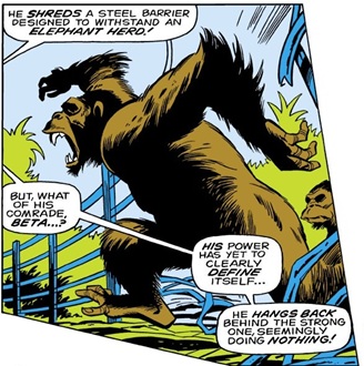 One of the two gorillas used by the Red Ghost, who had honed Beta's killer instincts and trained him to fight like a veteran warrior. Following his exposure to the radiation of the Cosmic Ray Intensifier, Beta was granted increased intellect and telepathy, and he could mentally dominate the wills of humans and gorillas. He used his power to immobilize the personnel of a S.H.I.E.L.D. base, and also gathered an army of other gorillas from the jungle; but Beta eventually rejected the Red Ghost's enslavement of them and turned against him. --Iron Man I#15 (15, 16 |