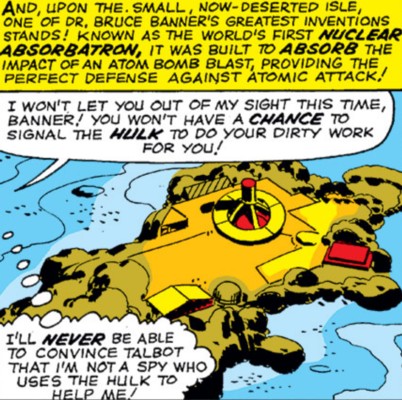 (Tales to Astonish I#64/2) - Major Talbot took Banner to Astra Island to conduct the first tests of the Absorbatron. Talbot wouldn't let Banner out of his sight while Banner prepared the Absorbatron for the atomic blast Talbot would order a nearby cruiser to carry out as soon as the device was ready. Meanwhile the island was surrounded beneath the surface of the sea by Leader's Humanoids. Banner rushed to the surface when he became agitated and couldn't prevent his transformation into the Hulk. Talbot followed him, but rushed back into the facility when he saw the Hulk and closed the bunker's door. He then pushed a series of buttons to lower the Absorbatron into an underground shelter enclosed with titanium shielding to keep it safe and then informed the crew of the cruiser that the Hulk was trapped on the island and asked them to contact General Ross for further instructions. On the surface of Astra Island the Hulk battled Leader's horde of Humanoids, who had now the order to capture the Hulk. A short time later Talbot received word from the cruiser that they were ordered to land a large fighting force on the island.