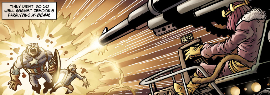 (Marvel Apes I#3/1) - When Zemook's top secret North Sea base was stormed by Captain America and Bucky he quickly mounted his experimental X-Beam, shot and paralyzed the American heroes. Helpless, they were stripped from their uniforms and strapped to flying bombs as Zemook planned to have them die as unknown soldiers. Meanwhile, Zemook delighted in parading around their costumes, a bloody banner for a revitalized reich to rally behind.