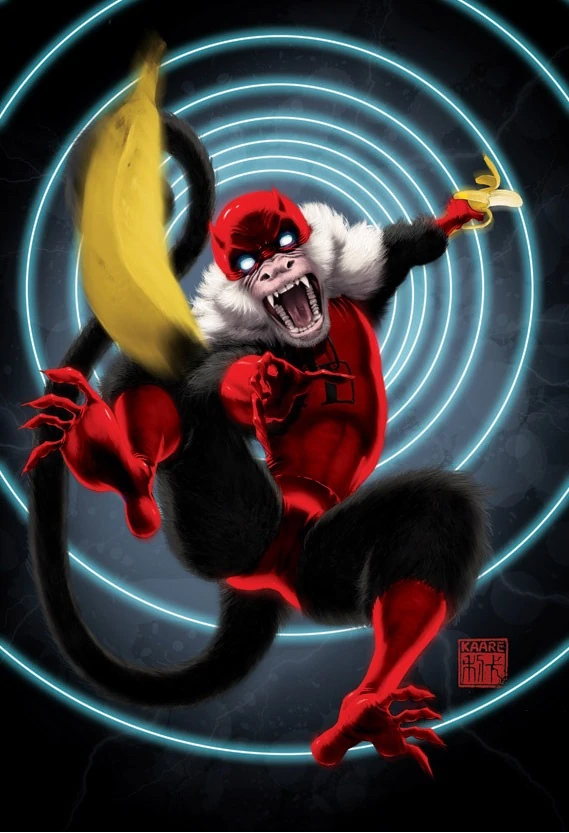 Although never appearing in the main storyline of Marvel Apes, a monkey Daredevil did appear on four different variant covers: Daredevil II#110, Kaare Andrews cover (August, 2008), Marvel Apes I#1 (Ramon Bachs cover), Marvel Apes I#1 (Mike Wieringo cover) and the Marvel Spotlight: Marvel Knights 10th Anniversary (Greg Horn cover). I've included the Kaare Andrews and Mike Wieringo covers to this profile. Fun little detail on the Mike Wieringo cover are the DG initials on his costume for Daregorilla.