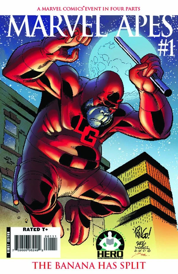 (Marvel Apes I#1/3 - BTS) - Blinded as a young primate in an accident involving radioactive chemicals, Matt Murdock developed extraordinary sensory abilities. Trained in martial arts, he adopted the identity of Daredevil, using his skills to fight crime and protect the innocent where the law alone could not.