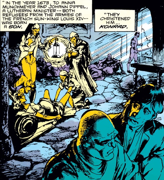 fourth generation of Lutheran clergy in the Dippel family. About I 670, religious persecution caused him to uproot his home and seek refuge at Frankenstein, and here Johann Konrad was born at the castle on August 10, 1673. (Doctor Strange, Sorcerer Supreme#37 (fb)) <1673 A.D.> - Anna Munchmeyer and Lutheran minister Johann Dippel -- both refugees from the armies of the French King Louis XIV -- birthed a son, whom they christened Konrad. (Real World History, courtesy of Cambridge.org) - Johann was 37-years-old and Anna was 33 when Konrad was born (Real World History, courtesy of Cambridge.org) - Pastor Dippel planned that Johann Konrad should become the fifth preacher in the family and to that end he undertook the boy's earlier education himself. With the death of Pastor Dippel in 1704, Johann Konrad ceased to hope for either university or Church appointments, and removed himself to Berlin to follow an alchemical career. (Real World History, courtesy of ancestors.familysearch.org) - Anna died in 1710. --Doctor Strange, Sorcerer Supreme#37 Note: Real world history from the Cambridge.org site also noted: In spite of its romantic name, Frankenstein Castle is an unexciting ruin about one mile south of Darmstadt, overlooking the Odenwald. Additional relative information is courtesy of ancestors.familysearch.org. |