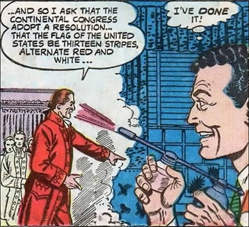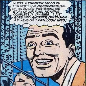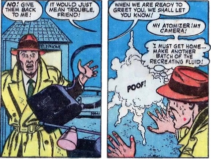 After secretly developing a chemical fluid which could recreate sights and sounds that had already occurred, reporter Kirk Dunster poured it into an atomizer. By spraying the mist, it allowed him to see and hear past events--a greater quantity of spray was able to recreate an event from centuries ago, while a weaker spray recreated events from just hours in the past. Dunster first sprayed the atomizer at his home--in the year 1777, a theater once stood at that location, and Dunster was able to see and hear a play performed in that theater, where actors were portraying the story of the American flag. Continuing to use the spray, Dunster was able to report on a variety of events by recreating recent happenings and witnessing them himself, so he was able to provide first-hand accounts of news stories and photographs for the Daily Globe. But "men from Mars" eventually took the atomizer, along with the rest of Dunster's recreating fluid from his home; the formula for the recreating fluid seemed to be complex, because Dunster doubted that he could ever duplicate it. --Uncanny Tales I#41/3 |