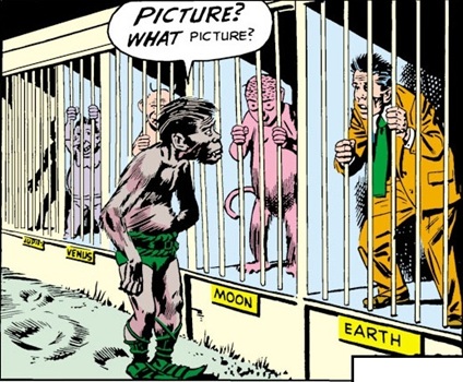 The inhabitants of the fourth planet, they seemed to have shaggy hair-covered bodies and large canine teeth; they somewhat resembled early ape-like Earth humanoids (possibly Homo habilis). Despite their relatively primitive appearance, they had an advanced civilization, and had even achieved interplanetary space-flight. They maintained a zoo on their planet where they displayed the captured inhabitants of other worlds, including specimens from Jupiter, Venus, and Earth's moon. After sending a spaceship to Earth, they tricked Freddie into climbing aboard; when their spacecraft returned home, they put the Earthman on display in a zoo cage. (Comment: This one panel was the only actual appearance of any Martians in this story--I'm only assuming that he was a native to that planet, and not just an interstellar tourist.) --Strange Tales I#9/3 |