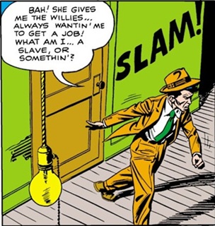 Freddie walked back home and asked his doting mother to give him a dollar for the movie; but she only had a few dollars left, which she was saving to buy herself a new pair of glasses, and she reminded Freddie that he had promised her he'd get a job and earn his own money. Tired of his mother's "lectures," the immature Freddie turned and stormed out of the apartment, slamming the door for good measure--he'd find some way to see the movie without her "crummy" dollar!