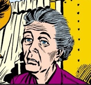 Possibly a widow, she (name unrevealed) lived in a run-down apartment with her unemployed and spoiled adult son Freddie. While she was doing the laundry, Freddie came home and asked her for a dollar; she reminded her son that she had already given him five dollars the day before... and besides, she was saving the few dollars she had left to buy herself a new pair of glasses. Freddie whined to her that she didn't need the glasses because she never had time to read anyway, and he wanted to see a movie. When she gently reminded her selfish son that he had promised to get a job and earn his own money, the immature Freddie became irate because of her "lecture," and he stormed out of the apartment--apparently it would be the last time she would ever see him. --Strange Tales I#9/3 |