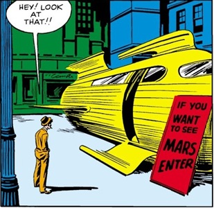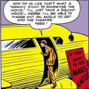 But when Freddie returned to the movie theater, he found what looked like a spaceship sitting in the street--a sign outside its open door proclaimed: IF YOU WANT TO SEE MARS...ENTER. Believing it was just a publicity stunt to advertise the movie, Freddie went inside, figuring that he could think of an angle to get into the theater for free.