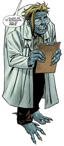 (Sabretooth: The Dead Don't Talk#1 (fb)) <1909> - Fritz became the lab assistant of Nathaniel Essex at the Ravencroft Institute, who considered replacing Victor Creed with him because Creed couldn't get over it that the mutant Logan had gotten the better of him. Creed didn't even know what Fritz was supposed to be and immediately threatened to get rid of him. Essex told Fritz to just ignore Victor and prepare the body Creed had delivered. Fritz stayed friendly and assured his master that he would do his job.