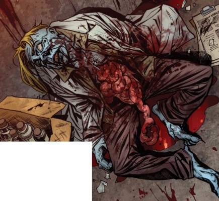 (Sabretooth: The Dead Don't Talk#1 (fb) - BTS) - Fritz was working at the lab when Creed killed him by disemboweling him. Creed then used Fritz's blood to write a message on the wall that he quit his job with Essex.