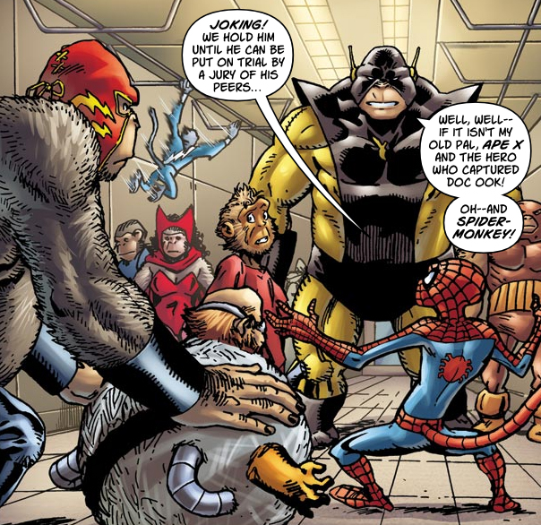 Group Membership: Ape-Vengers (Ape X/Roy Reyna, Captain America/Steven Rogers, Hawkape/Clint Barton, Iron Mandrill, Juggermonk/Cain Marko, Monkey-C, Ms. Marvel/Carol Danvers, Quicksilver/Pietro Maximoff, Sandmonk, Scarlet Witch/Wanda Maximoff, Speedball/Robert Baldwin, Spider-Monkey/Peter Parker, Thorangutan/Thorangutan Odinson, Vision, Wasp/Janet van Dyne, "Wonder Ape"/Simon Williams)