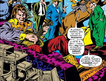 Later, after Howard parted ways with G.Q. Studley and began working with Mad Genius Associates, an interest group met with Howard at Dreyfuss' Drey Gultch ranch to discuss became business associates with Howard. During the meeting, Gultch played around on his guitar while Howard told off the interest group, who left angry when Howard refused to associate with them. An angry Howard then commented that the mangy magnates that ruled the world killed him and Gultch replied that they just might. Later still, following a string of assassination attempts on Howard's life, Howard and Beverly returned to their New York hotel, where Dreyfuss Gultch informed them of a smear campaign running in the newspapers.