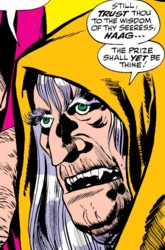 (Thor I#165) - Karnilla called over Haag because she needed her mystic prowess to go after Balder, who had spurned her advances. Karnilla didn't want to harm Balder, but wanted him to be brought to her. Haag and Karnilla headed to the Space Pool where Haag conjured the image of Balder. They found him on Earth with Sif and Thor, but Karnilla wanted to watch him for a bit before the Haag caught him for her. Him kidnapped Sif and Thor and Balder followed him to a distant dimension. While they were there Haag finally took her shot at reaching through the Space Pool and taking Balder to Nornheim, but Thor freed Balder from Haag's grip and then forced Haag back through the portal. (Thor I#166) - Karnilla was mad at Haag for failing to capture Balder for her and demanded an explanation. Haag revealed that Balder's heart had been conquered by Karnilla's spell of love, but that his devotion to duty was greater. Haag assured Karnilla that Balder would still be hers soon. Haag molded a graven image of Balder and as soon at it was finished and bewitched, Balder would be unable to escape Karnilla. (Thor I#167) - Haag delivered a new Balder figurine made of mystic enchanti-clay to Karnilla. Haag explained that whatever happened to the clay figurine would happen to Balder as well. Loki stole the Balder figurine from Haag to harm Balder and lure Thor to Earth so he could steal Mjolnir. (Thor I#170) - Haag was present while Karnilla and Loki watched through her enchanted Space Pool Balder and the Warriors Three fight the Thermal Man. Karnilla used magic to bring the foursome to Nornheim to save them from further harm at the metal hands of Thermal Man. Haag watched as Loki declared Karnilla to be an enemy of his from now on after saving the four Asgardians. (Thor I#175) - Haag notified Karnilla that her captives stood before her, but Balder and the Warriors Three wished to be captives no longer after their had healed and demanded to be allowed to leave in peace or by force. Karnilla allowed them to leave peacefully even though she knew that danger awaited them in Asgard. Haag was still baffled that Karnilla was in love with Balder and mocked her because Loki would likely kill him soon. Karnilla angrily screamed at Haag to get out of her sight and tossed a vase after her because if Balder died so did Karnilla's heart. |