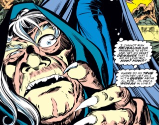 (Thor I#399) - Haag showed Karnilla that Balder survived the battle against Seth's Demons of Death. She was sure that he would not survive much longer, which angered Karnilla even though she knew that Asgard would not be able to hold out much longer and she couldn't help them because hiding her own kingdom from Seth required all her magic power.