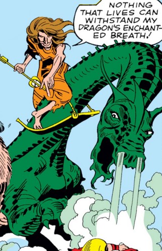 (Journey into Mystery I#101/3) - A long time ago a young Loki betrayed Asgard and made a hole in Asgard's defenses he told evil forces opposing Asgard about. Among those evil forces were the Norn Hag and her dragon Ulfrin, the Wolf Gods Hati and Skoll, Geirrodur the Troll, the Rime Giants and the last of the Ice Giants. Loki tricked Thor to guard the hole by himself and Thor tried, but ultimately failed after Ulfrin's enchanted breath weakened him and a Rime Giant used a spell to that slowly transformed Thor into a tree. Odin and the forces of Asgard heard the clanging of Thor's sword and came to his aid. The evil forces soon fled, including Ulfrin and the Hag. --Journey into Mystery I#101/3 Note: Ulfrin was not in Avengers III#1 despite the Thor Marvel Index and many online sources claiming that he was. The character many mistook for Ulfrin was actually Skord. |