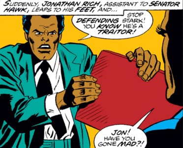 (Iron Man I#95) - Jonathan Rich was Senator Hawk's assistant, who was glad that Stark agreed to a meeting with Hawk, but already considered Stark guilty of treason. Hawk reminded Jon that Stark was not indicted yet and that he actually thought that Stark had been framed.
