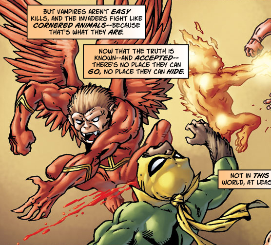 (Marvel Apes I#4/1) - During that very night, as Dr. Fiona Fitzhugh was forced to activate the portal to Earth-616. Just as the portal was to be opened, Iron Paw and other outcasts, arrived in force. Iron Paw was seen facing Spider-Monkey during the fight until the original Captain America, saved by the Outcasts, revealed himself and exposed Baron Blood's deception. When the vampiric Invaders appeared, the Outcasts allied with the Ape-Vengers and Fantastic Four to battle Blood and his forces when Red Raven seemed to slit Iron Paw's throat with his razor-sharp claws. In the climactic battle Fitzhugh and the Gibbon returned to their home-reality with the gravely wounded Speedball, after which Ape X slew Baron Blood, destroying the portal in the process. The blast tore apart part of the Ape-Vengers Tower, but the heroes emerged victorious.