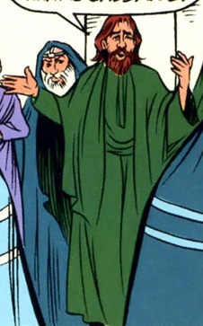 Joseph of Arimathea was referenced in all four of the Gospels, although only the Gospel of John mentioned he'd been accompanied by Nicodemus in taking Jesus down from the cross. All four say he was a wealthy man, but Mark, John and Luke also said he was a member of the Sanhedrin. None of the Gospels identified him as being present during Caiaphas' interrogation of Jesus, but including him in that scene in The Life of Christ: The Easter Story I#1 seems reasonable - as a member of the Sanhedrin, he would most likely have been there, and the Gospel of John indicates he'd disagreed with their prosecution of Jesus.