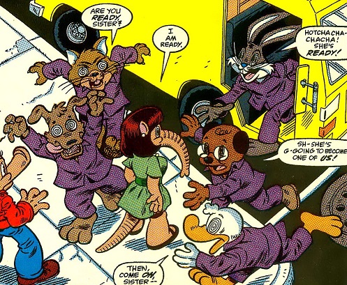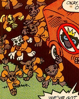 (Marvel Tales II#233/2) - Mary Jane drove the bus through the cult estate's gates and the De-Programmers ran after the scattering Larval Zombies, who sought their Master for help. Mary Jane found the zombified Porker obsessively polishing the statue idols, but a gas grenade weakened his strength and De-Programmers forced him to watch video footage of supposed deadly enemies as shown in Larval Comics instead enjoying friendly times together. This shocked Porker back to reality and he changed into his Spider-Ham guise to fight Salamander, but the Dee-See Zombies, led by Bat-Bird, opportunistically swooped in seeking to replace Larval Zombies with Batmaniacs. Confused how to fight both cults, Spider-Ham was confronted by Salamander, who duplicitously offered Spider-Ham his own graphic novel and limited bookshelf series. Spider-Ham submitted to his pride and drove away the Dee-See Zombies and knocked down the De-Programmers, as well as chasing Mary Jan away. Victorious, Spider-Ham pursued Salamander and suggested various creative teams for his graphic novel, but Salamander was overwhelmed and used a giant boot to kick Spider-Ham far far out of the compound.
