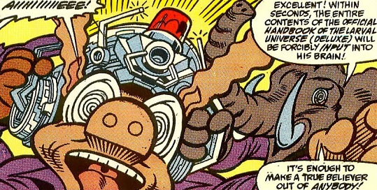 The Zombieizer was a complex data matrix with an instantaneous neural interface that contained the entire contents of the Official Handbook of the Larval Universe (Deluxe Edition), a fact-packed encyclopedic guide to the Larval Universe (Earth-8311) comprising in-depth profiles of its greatest heroes and villains, places, items, teams, races and more. Once placed on the head and activated, the Zombieizer downloaded the entire contents directly into the wearer's brain, converting the wearer into a True Believer and Larval Zombie.