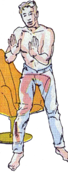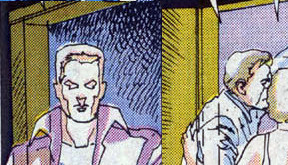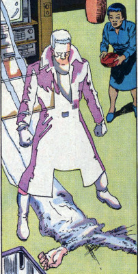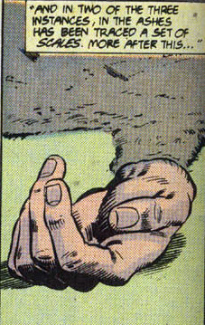 (Justice II#16 (fb)) - Shortly after Lonnie slept with his latest conquest/victim, Melinda, he was tracked down by Justice (see comments), who had appointed himself as the judge, jury and executioner of paranormals who abused their powers. The vigilante kicked in the door to Lonnie's apartment and confronted his prey, who tried unsuccessfully to talk his way out of the confrontation. Outlining Lonnie's crimes so the condemned man would know why he was being punished, Justice then incinerated the Lothario, leaving only Lonnie's left hand and head intact, both to enable the police to identify the victim and to ensure the authorities would know all of Justice's recent slayings were connected, and thus eventually to have the killings serve as a warning to other paranormals. To this end Justice also traced a set of scales in the ashes. Lonnie's head ended up a short distance from the ashes, hidden behind a potted plant, presumably having bounced and rolled along the floor at the moment he was decapitated.