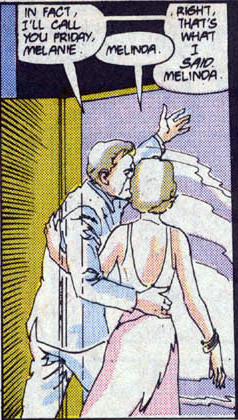 Melinda slept with Lonnie Poole (presumably seduced using his power to influence women). Having enjoyed the sex, as she prepared to leave she asked him to promise to call her. He reassured her that he would, but his hinted at his insincerity by failing to correctly remember her name. --Justice II#16